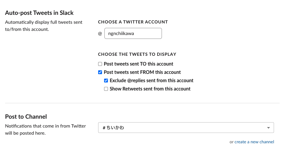 上記のような雰囲気で、Slack公式のTwitter連携をセットするといい感じです。(このアカウント宛のツイートとか、このアカウントからのメンションは除外)